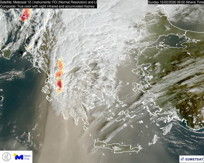 Η εικόνα προέρχεται από τον Ευρωπαϊκό δορυφόρο Meteosat 12 της EUMETSAT και λήφθηκε την Κυριακή 15 Φεβρουαρίου 2026 στις 09:00 (τοπική ώρα).
