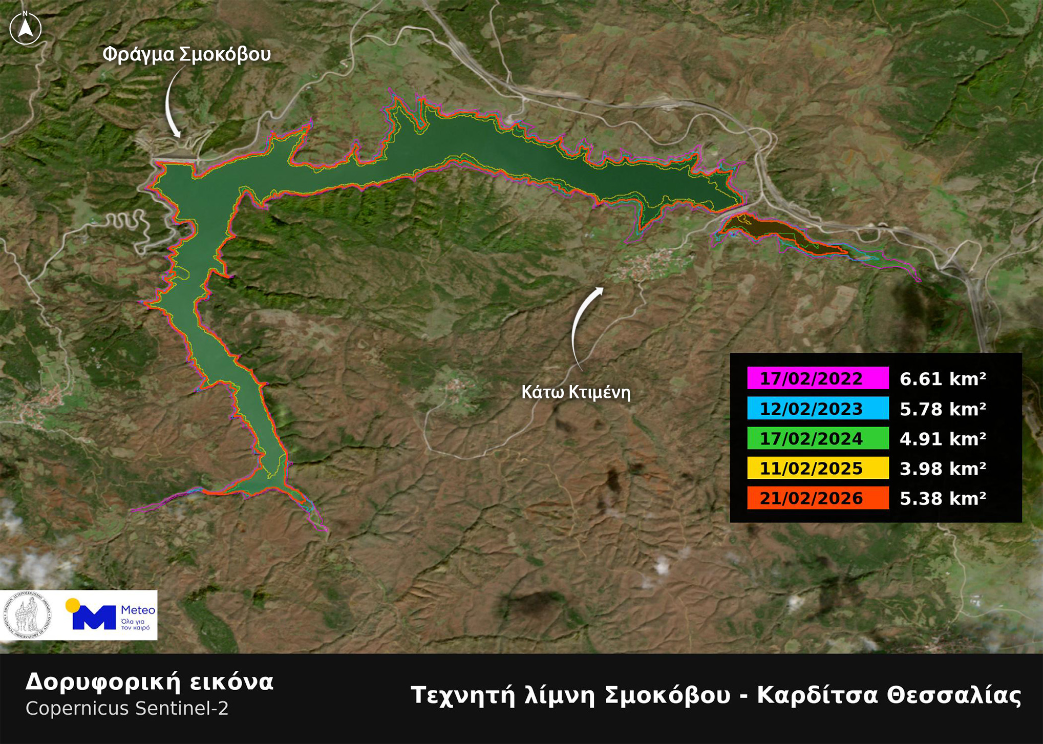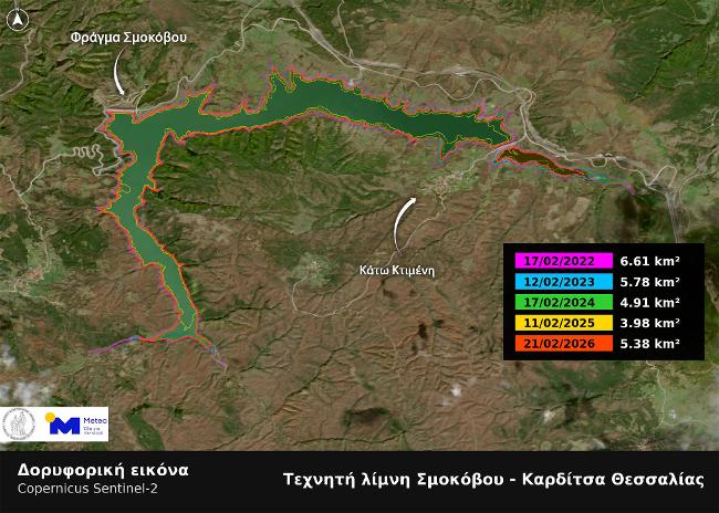 Η έκταση της τεχνητής λίμνης Σμοκόβου παρουσίασε σημαντική αύξηση μετά τις συνεχείς βροχοπτώσεις του τελευταίου διαστήματος στην Ελλάδα και στην ευρύτερη περιοχή της Καρδίτσας, όπου βρίσκεται η λίμνη. Πιο συγκεκριμένα, σύμφωνα με δορυφορικές εικόνες του Ευρωπαϊκού δορυφόρου Sentinel-2 τις οποίες επεξεργάστηκε η μονάδα ΜΕΤΕΟ του Εθνικού Αστεροσκοπείου Αθηνών, η έκταση της λίμνης Σμοκόβου το Σάββατο 21 Φεβρουαρίου 2026 ανέρχεται στα 5,38 km2, δηλαδή σε επίπεδα κοντά σε εκείνα στα οποία βρισκόταν πριν από 3 χρόνια, κατά την ίδια περίοδο.