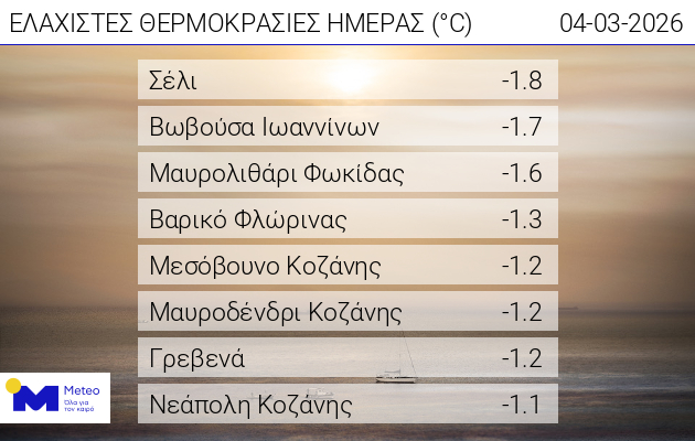 Στους -1 με -2 °C έπεσε ο υδράργυρος το πρωί της Τετάρτης 04/03 στα βόρεια ηπειρωτικά τμήματα της χώρας. Σύμφωνα με το δίκτυο αυτόματων μετεωρολογικών σταθμών του meteo.gr / Εθνικού Αστεροσκοπείου Αθηνών, η χαμηλότερη θερμοκρασία καταγράφηκε στο Σέλι και ήταν ίση με -1.8 °C. Στον σχετικό πίνακα παρουσιάζονται οι 8 σταθμοί που κατέγραψαν τις χαμηλότερες θερμοκρασίες το πρωί της Τετάρτης 04/03.