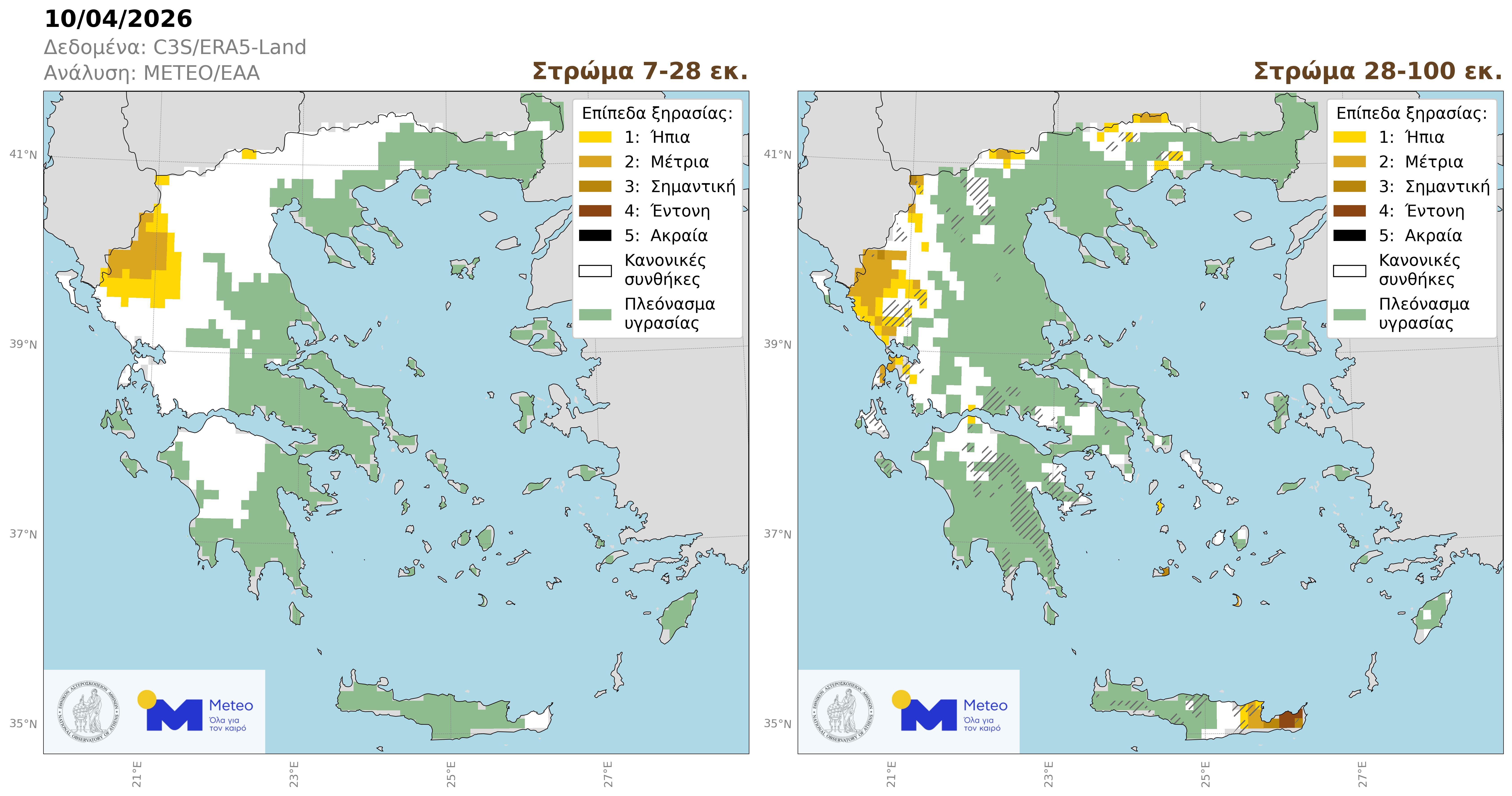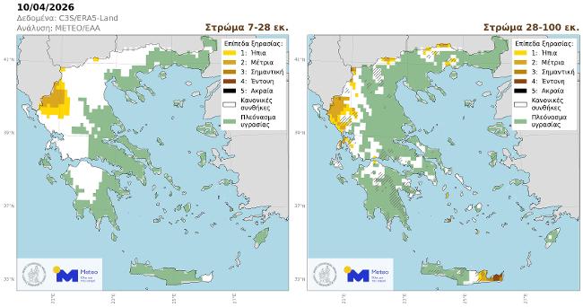 Το παρόν δελτίο παρουσιάζει την ανάλυση της ομάδας ΜΕΤΕΟ του ΕΑΑ για τις συνθήκες ξηρασίας στην Ελλάδα κατά την 10η Απριλίου 2026. Η ανάλυση βασίζεται στην απόκλιση της υγρασίας των στρωμάτων υπεδάφους από τα κανονικά για την εποχή επίπεδα σε δύο στρώματα: