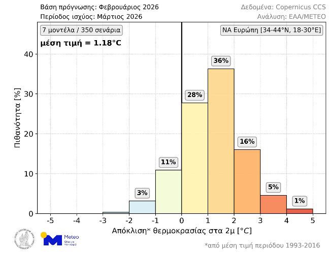 Θερμότερος του κανονικού αναμένεται να είναι ο ερχόμενος Μάρτιος στην ΝΑ Ευρώπη (συμπεριλαμβανομένης της Ελλάδας) σύμφωνα με τις μακροπρόθεσμες προγνώσεις που εκδόθηκαν στις αρχές Φεβρουαρίου. Όπως φαίνεται στο παρακάτω γράφημα (Εικόνα 1), σύμφωνα με το 86% των διαθέσιμων σεναρίων η μέση θερμοκρασία Μαρτίου θα είναι υψηλότερη από τα κανονικά για την εποχή επίπεδα (περίοδος αναφοράς: 1993-2016). Συγκεκριμένα, η πιθανότητα για θετικές αποκλίσεις μεταξύ 0 και 1°C, μεταξύ 1 και 2°C και άνω των 2°C είναι 28%, 36% και 22% αντίστοιχα. Οι πιθανότητες για αρνητικές αποκλίσεις μεταξύ 0 και 1°C και άνω του 1°C είναι 11% και περίπου 3% αντίστοιχα. Η μέση τιμή των 350 σεναρίων είναι +1.18°C.