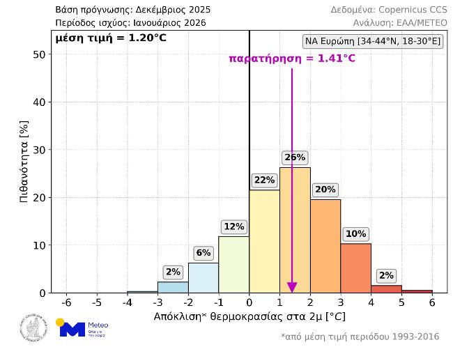Όσον αφορά τον περασμένο Ιανουάριο, η μέση θερμοκρασιακή απόκλιση στην ΝΑ Ευρώπη ήταν +1.41°C, ενώ η μέση τιμή όλων των σεναρίων της μακροπρόθεσμης πρόγνωσης που εκδόθηκε τον Δεκέμβριο του 2025 ήταν +1.20°C. Όπως φαίνεται στο παρακάτω γράφημα (Εικόνα 3), το μέγεθος της απόκλισης που παρατηρήθηκε είχε πιθανότητα 26% και ήταν το πιθανότερο πεδίο τιμών στην μακροπρόθεσμη πρόγνωση.