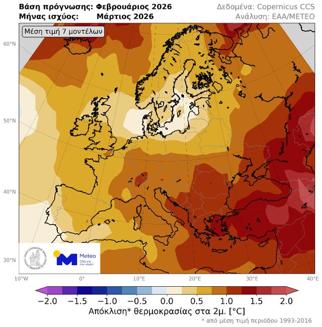 Συνολικά για την ευρωπαϊκή ήπειρο, ο χάρτης της Εικόνας 2 απεικονίζει την απόκλιση της μέσης θερμοκρασίας Μαρτίου με βάση την μέση τιμή των 350 σεναρίων. Όπως προκύπτει, θετικές αποκλίσεις αναμένονται σε όλη την ήπειρο, με τις τιμές να κυμαίνονται από +0.5°C στην δυτική και βόρεια έως +1.5°C στην νοτιοανατολική Ευρώπη.